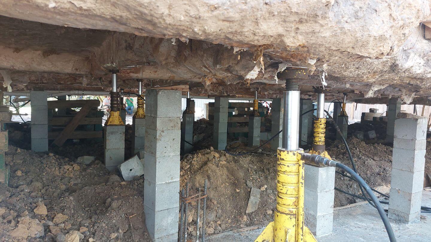 A unified jacking system is used to raise the house. A series of hydraulic jacks are installed under the house on roughly every other piling. Each has a hose connecting it to the unified jacking machine positioned adjacent to the house. The jacks work in unison and are monitored in real-time by pressure gauges on the jacking machine. Before the first “push”, all the jacks and hoses are inspected to ensure there are no leaks or loose connections. They are then slowly pressured up until each shows a steady reading on the pressure gauge.